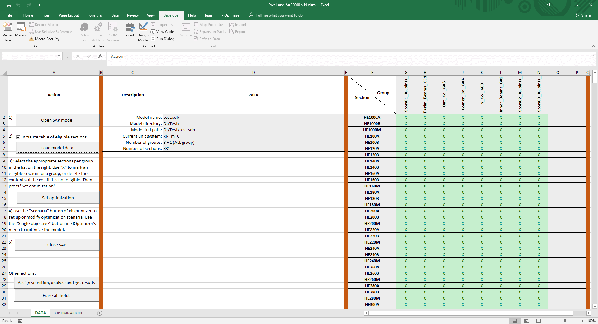 Delete the contents of the cells, or use a single "X" to mark eligibility. When you are ready, press Set optimization and all variables in xlOptimizer will be set automatically. You can check the available sections per group in the Optimization sheet, although you should not alter anything there.