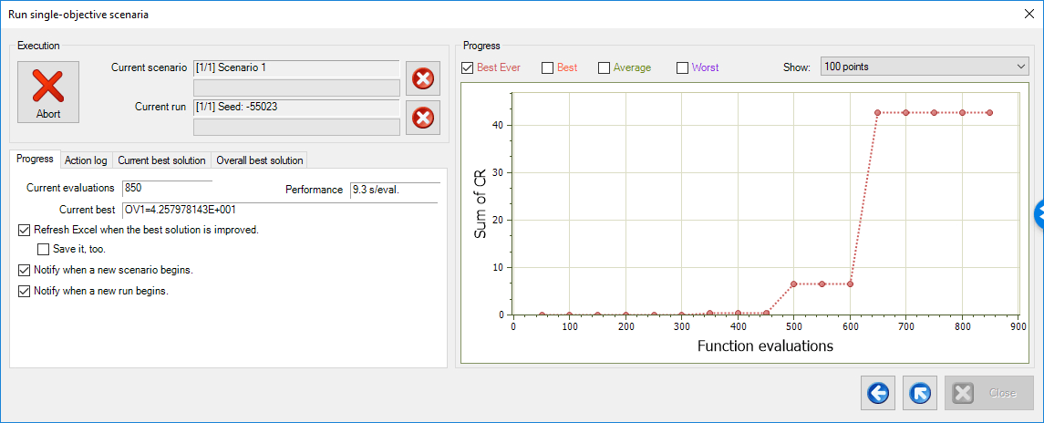 By default, a single scenario with Differential Evolution is set-up to run. You can modify the scenaria using xlOptimizer's menu. You should not, however, change anything in the Objectives, Variables, Constraints and Execution.